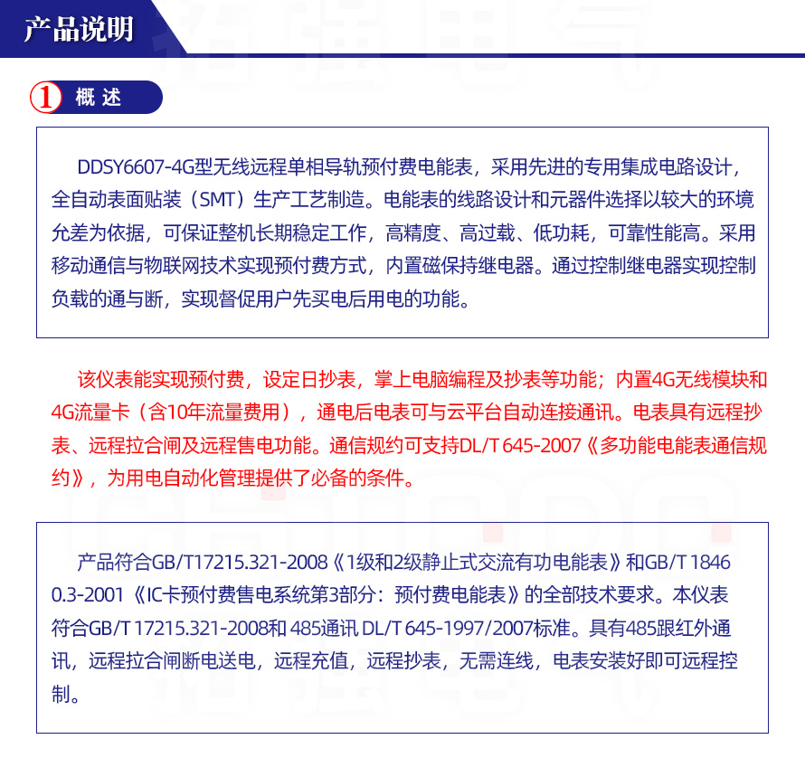 DDSY6607型係列GPRS遠程導軌式單相預付費(fèi)電能表采用屏(píng)蔽式、密封型結構,用單片微控製器(qì)進行數據采集(jí),處理和保存。具(jù)有良好的抗電磁幹擾,低(dī)功耗(hào),高準確度了,高(gāo)過載,長(zhǎng)壽(shòu)命。安全符合GB/T17215-2002、GB/T18460.3-2001和DL/T645-1997標準中對電子式單相預付費電度表的(de)全部技術要求。