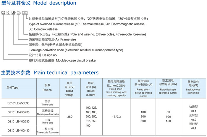 DZ101LE係列漏電斷路器是由(yóu)DZ10塑料外殼式斷路器派生而成,具備斷路器功能外,為了防止人身(shēn)觸電及線(xiàn)路漏電,在斷路(lù)器上加裝漏電脫扣器,設計成具有(yǒu)過載、短路、漏電(diàn):種保護為一體的產品(pǐn)。該產品是目前大容量線路器中較為理想的漏電保護(hù)電器。並符合IEC75-92、IE947.2國際標準及(jí)GB6829-95、CB14048.2-94國家標準。